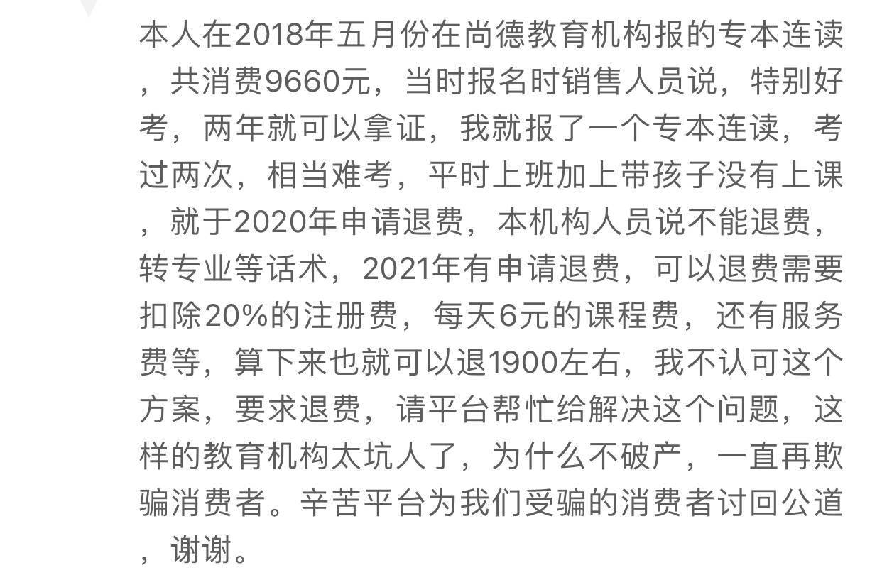 该用户称自己于2018年5月在尚德机构报名专本连读,共计消费9660元。当时销售人员承诺两年即可拿证,但实际上该用户考过两次,相当难考。再加上平时上班带孩子没有上课,因此于2020年申请退费。