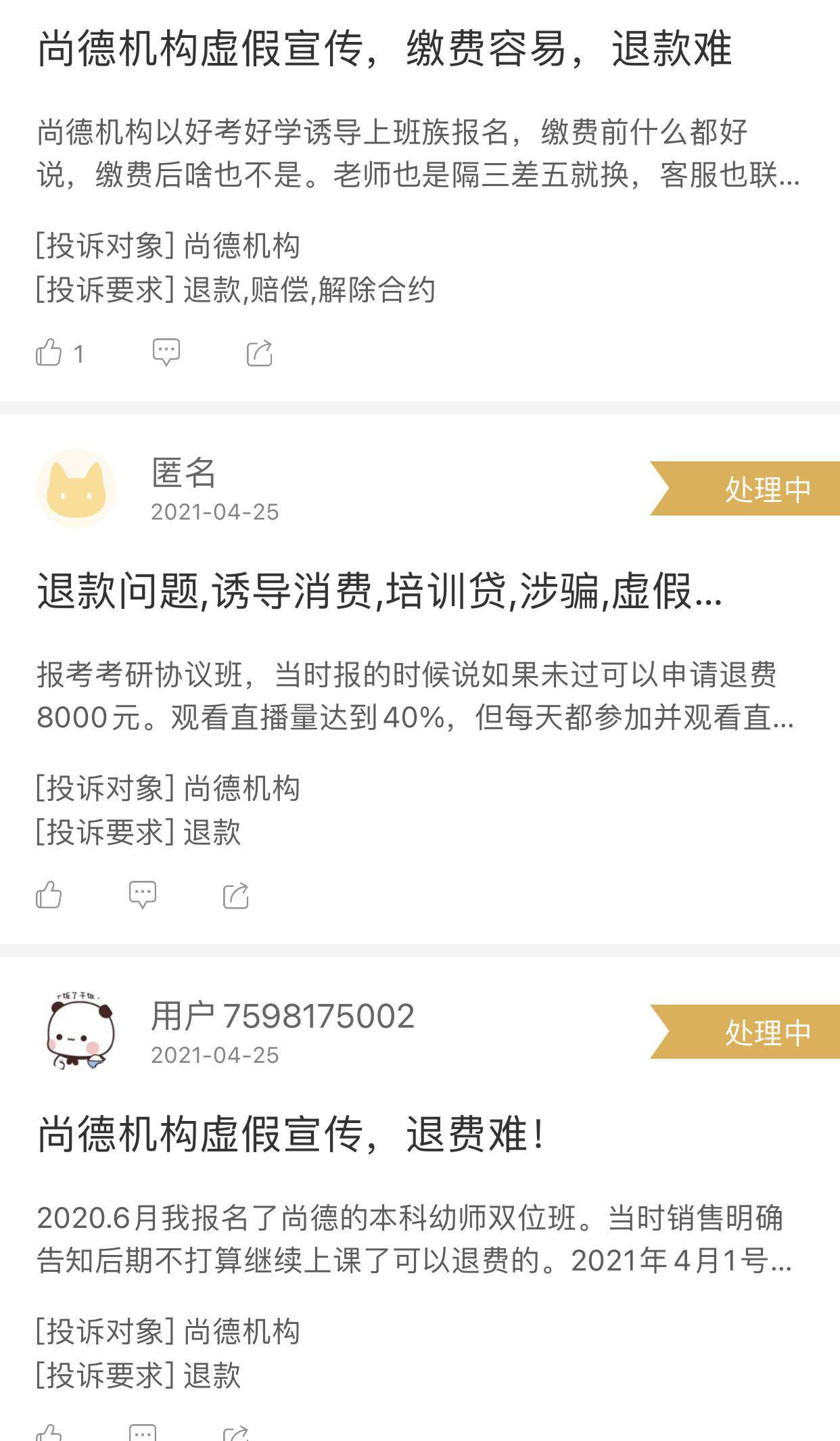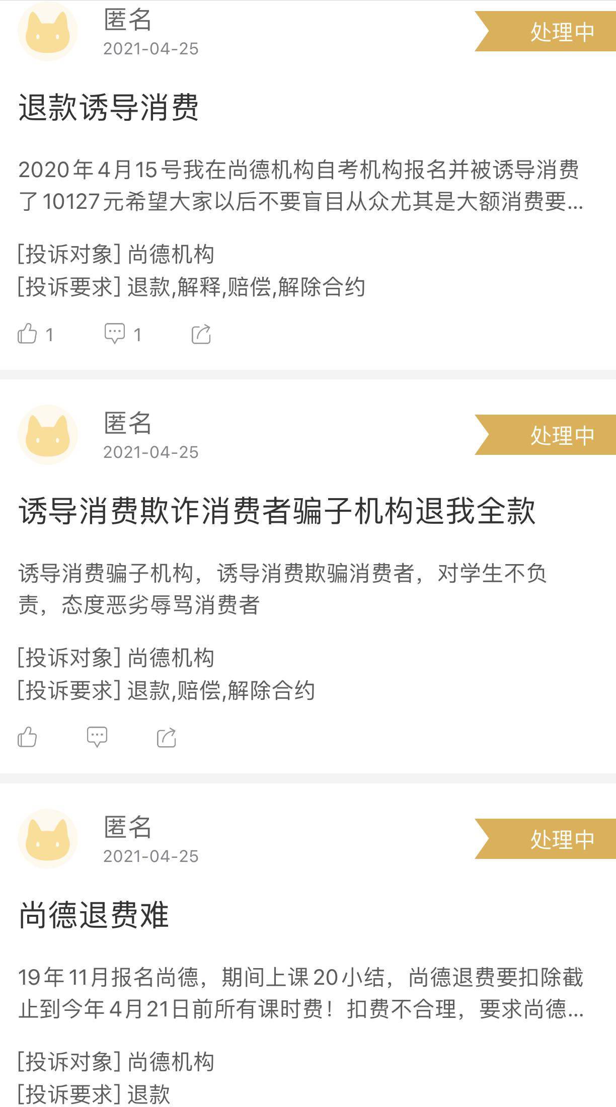 除此之外,黑猫平台中还有很多消费者投诉尚德机构存在虚假宣传、退费难以及诱导消费等问题。
