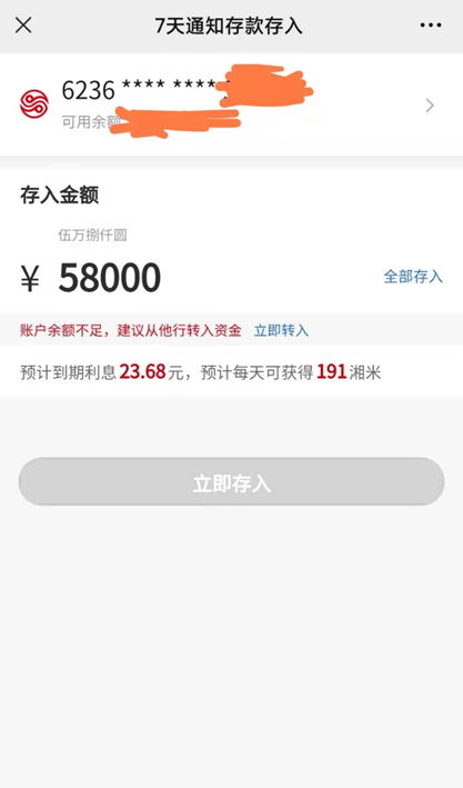 7天通知存款年利率2.1%+天天湘米。同样,如果存入5.8万元,预计到期利息23.68元+7天×191湘米,即存入5.8万元,7天后实际收益约为37.05元。