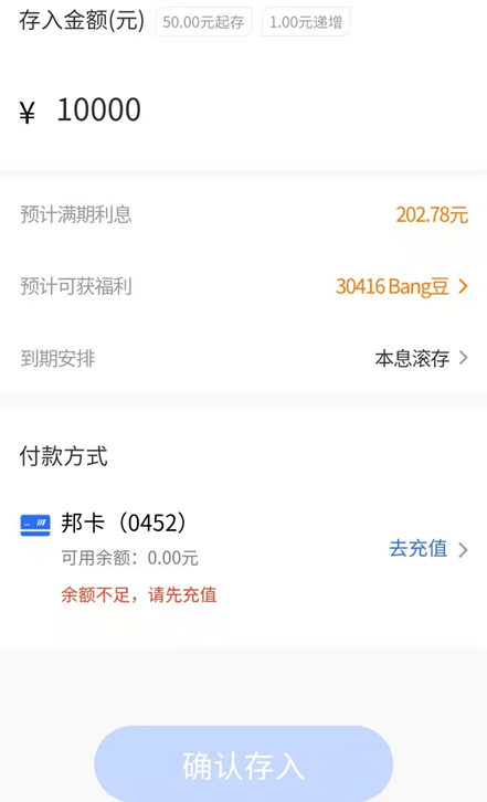 其中,1年期定期存款年利率2%+资产奖励,如果存入1万元,期满将获得202.78元利息+30416 Bang豆。根据页面提示,资产奖励计划是众邦银行推出的客户答谢活动之一,参与活动的资产,可以获得Bang豆奖励;奖励将于产品到期后发放,如提前支取,则不发放奖励。