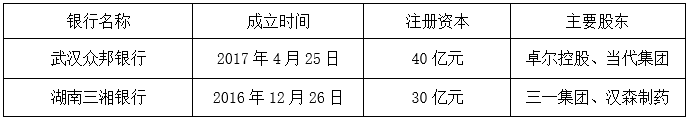 公开资料显示,武汉众邦银行成立于2017年4月25日,注册资本40亿元,主要股东为卓尔控股、当代集团;湖南三湘银行成立于2016年12月26日,注册资本30亿元,主要股东为三一集团、汉森制药。