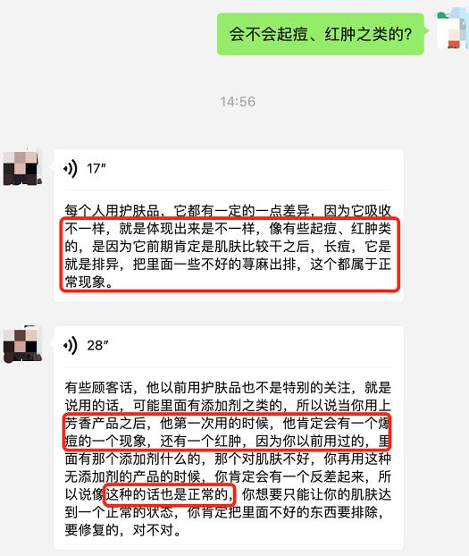 中国质量新闻网工作人员以购买产品的名义添加了上述芳香世家卖家的微信,发现其仍在朋友圈宣传推介芳香世家胶原蛋白修复系列的产品。工作人员询问,使用芳香世家胶原蛋白修护精华凝露是否会导致红肿、起痘?卖家表示,红肿起痘就是排异,“属于正常现象”。