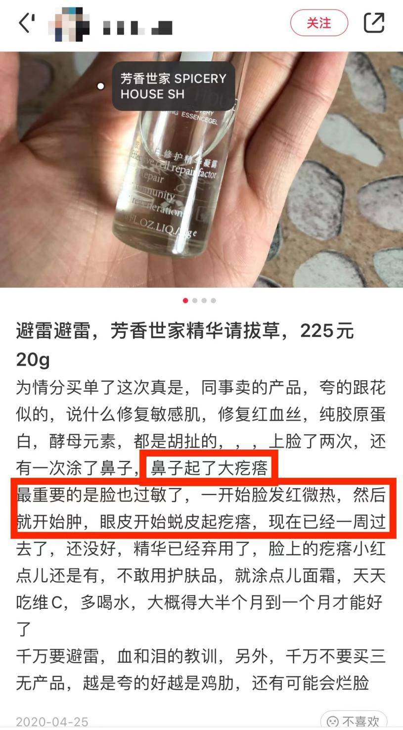 有网友回复该帖称:“我是敏感痘痘肌,用了就疯狂长,用了一年还一直起。后来停了慢慢没有了。”该网友表示,她的芳香世家产品购自实体美容院。