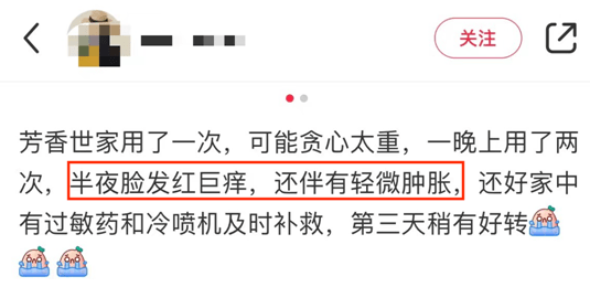 另一位用户发帖称,使用芳香世家修护精华凝露后“鼻子起了大疙瘩”“脸部发红发热、变肿、眼皮蜕皮起疙瘩”。中国质量新闻网私信向其求证得知,她使用的芳香世家产品购自微商,过敏症状历经半个多月才消失。