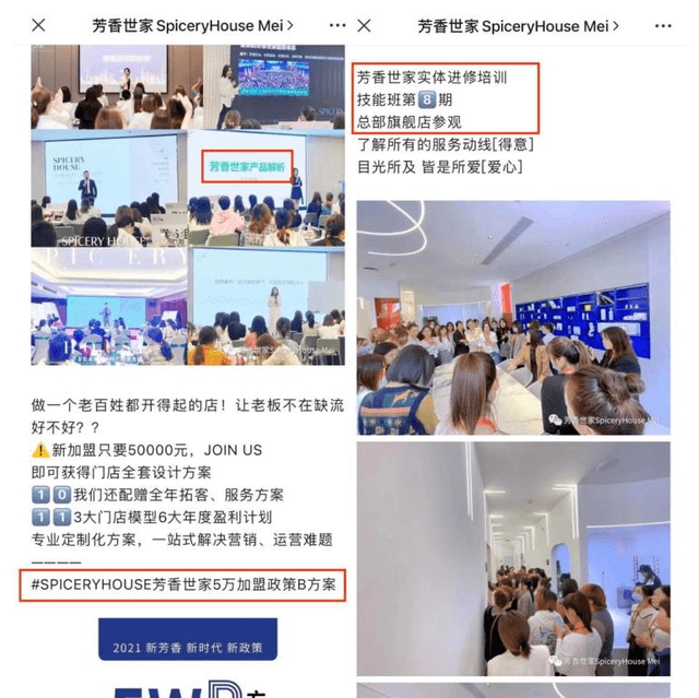 刘女士购买产品的“芳香世家Spicery House Mei”微信公号注册于2018年7月,截至2022年1月已发表过858篇内容,包括芳香世家各系列产品介绍、“只要50000元即可加盟芳香世家,获得门店全套设计方案”等加盟政策宣传、创业故事、线下服务体系、实体进修培训等。公众号主体为个人,在文章中多次声称自己是“芳香世家合伙人”“芳香世家CEO”。