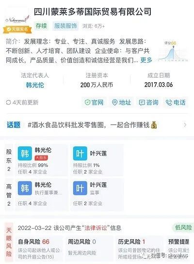 据报道显示,璐比玛斯是四川蒙莱多蒂国际贸易有限公司旗下的一款内衣品牌,该公司成立于2017年3月6日,法定代表人韩光伦,股东有韩光伦、叶兴莲。公司注册资本200万元,实缴0元。