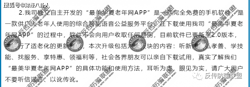 该《声明》的言下之意是汇鑫隆泰公司运营的是“最美华夏老年网APP”,而并非媒体报道的“华夏老年网”,所以所有有关华夏老年网涉嫌传销的报道均与汇鑫隆泰公司及旗下的“最美华夏老年网APP”无关。