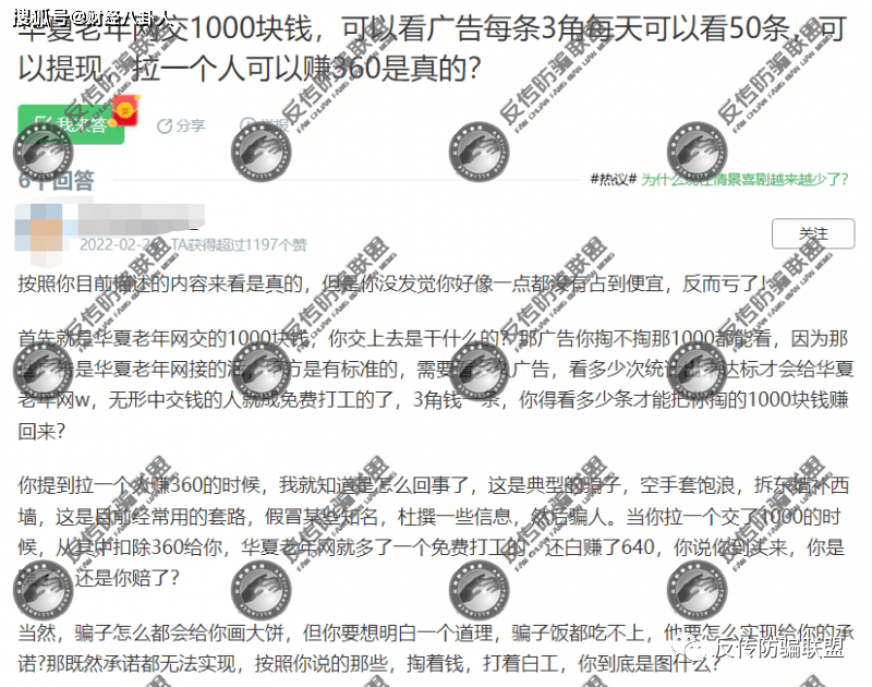 反传防骗联盟注意到,在百度知道平台,一位用户询问“华夏老年网交1000块钱,可以看广告每条3角每天可以看50条,可以提现,拉一个人可以赚360是真的?”