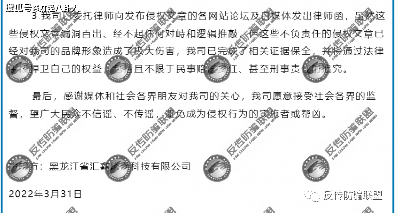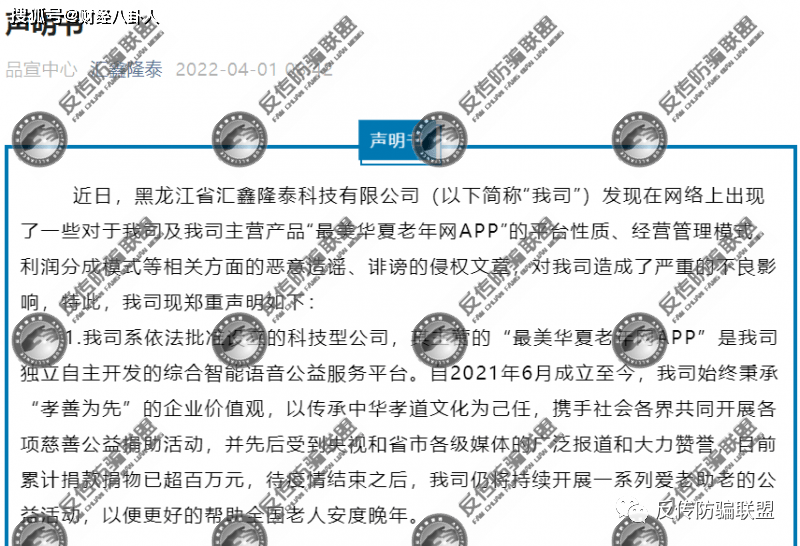 2022年4月1日,华夏老年网的主体运营公司汇鑫隆泰在其微信公众号发布了一则《声明》,该声明主要表达了三个意思:第一,汇鑫隆泰旗下的主营产品是“最美华夏老年网APP”;第二,“最美华夏老年网APP”完全免费,不收取任何费用;第三,对于发文抵毁公司的网站论坛及自媒体平台将予以法律追究。