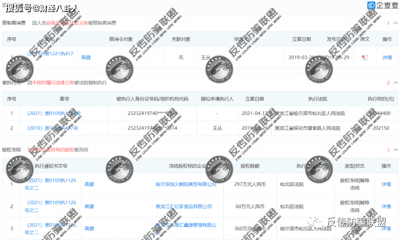 值得一提的是,反传防骗联盟通过企查查查询发现,高健的还有不少“黑历史”: