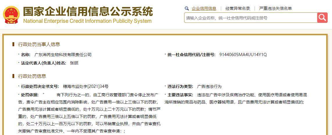广东浠芮生物科技公司广告违法被罚 为“燕教授”运营方