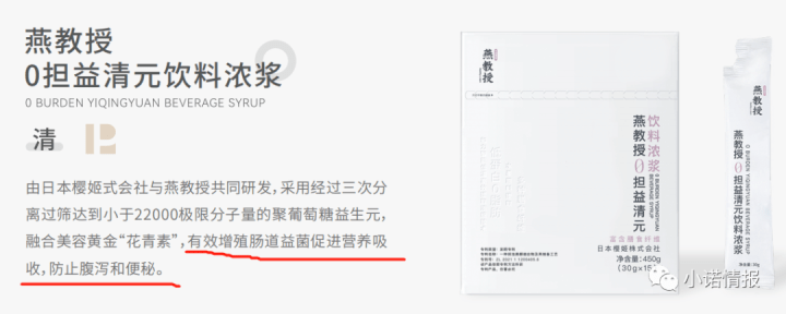 然后我们看到的是“燕教授”宣传的文案和图片中标注了很多功效,比如:“0担益清元饮料浓浆”标注“有效增殖肠道益菌促进营养吸收,防止腹泻和便秘”。