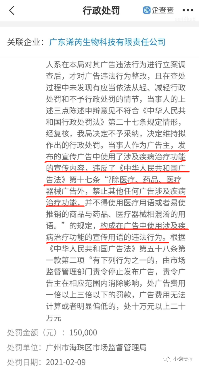 以上这些介绍都是违反了国家相关法律法规的,而此前“燕教授”也因为这样的违规宣传被相关部门罚款。但是貌似“浠芮生物科技”并没有在之前的罚款中吸取教训,目前还是这样宣传。