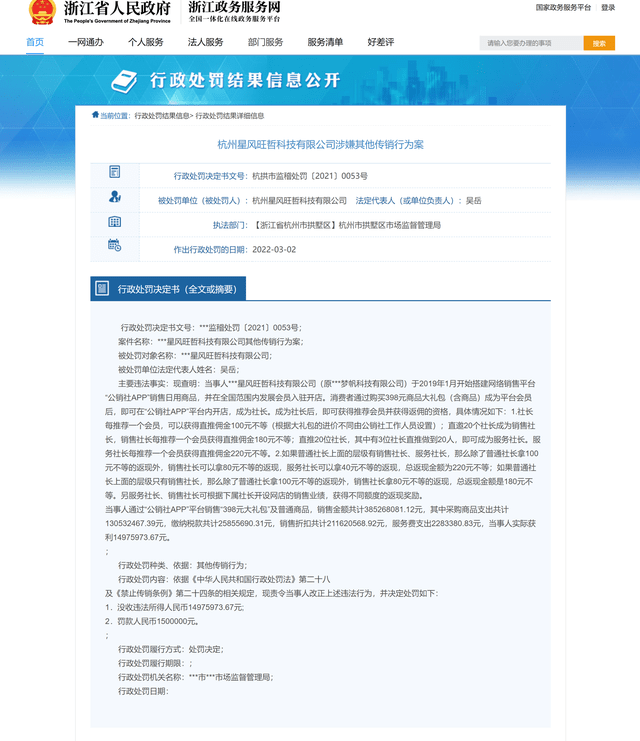 日前,北青网健康在浙江政务服务网上看到一则行政处罚信息,显示为杭州星风旺哲科技有限公司因涉嫌传销,被杭州市拱墅区市场监督管理局共计罚没资金16475973.67元。