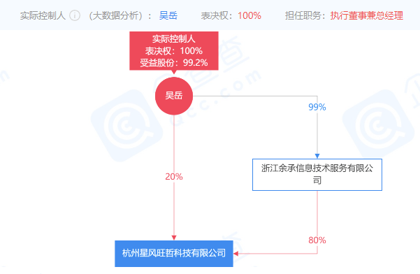 企查查显示,杭州星风旺哲科技有限公司成立于2019年1月7日,(曾用名:北京梦帆科技有限公司)注册资金1亿元,法人代表为吴岳,也是公司的实际控制人,直接持股20%,通过浙江余承信息技术服务有限公司简介间接持股后,最终受益股份达到了99.2%。