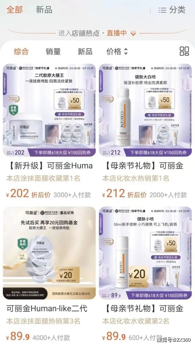 可丽金目前涉及喷雾、精华、洁面面膜、面霜等诸多品类,品牌天猫旗舰店销量最高的胶原蛋白修复面膜月销在8000以上。