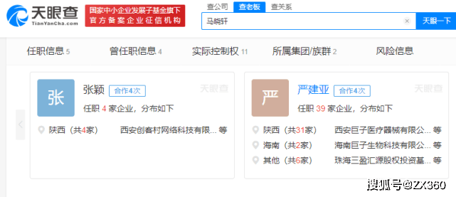 天眼查官网显示,创客村创始人马晓轩与巨子生物公司总经理严建亚有4次合作记录。