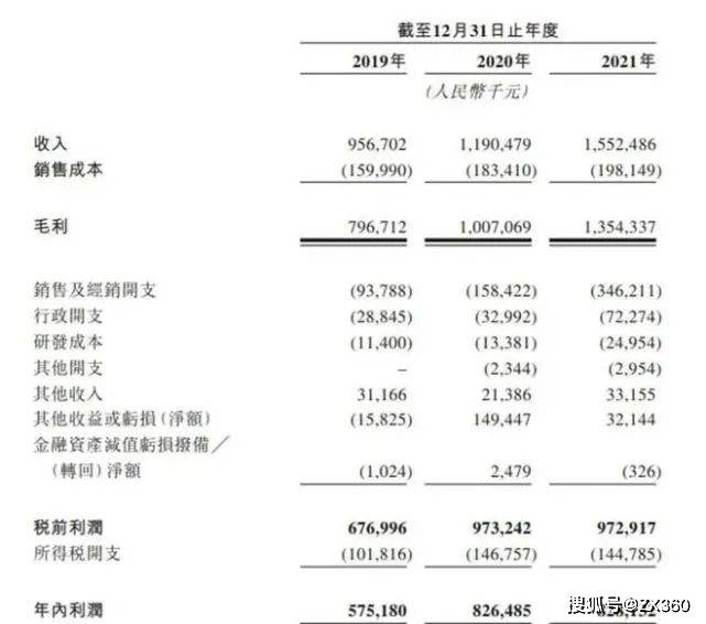 财务数据方面,2019年、2020年及2021年,巨子生物收入分别为约9.57亿、11.90亿、15.52亿元;净利润分别为约5.75亿、8.26亿、8.28亿元,同期净利率分别为60.1%、69.4%及53.3%。