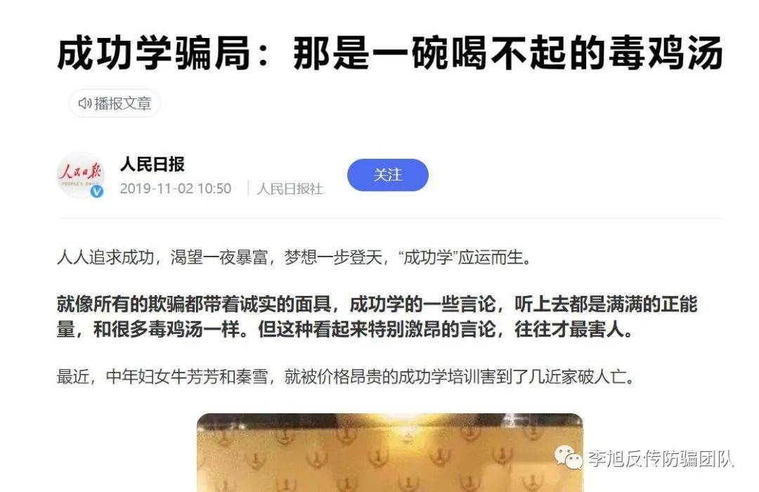 之后,《人民日报》百家号也发文《成功学骗局:那是一碗喝不起的毒鸡汤》称,“成功学的一些言论,听上去都是满满的正能量,和很多毒鸡汤一样。但这种看起来特别激昂的言论,往往才最害人。”