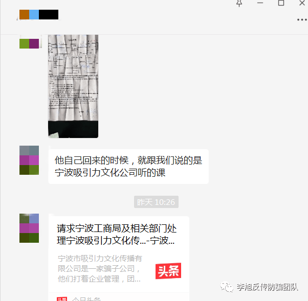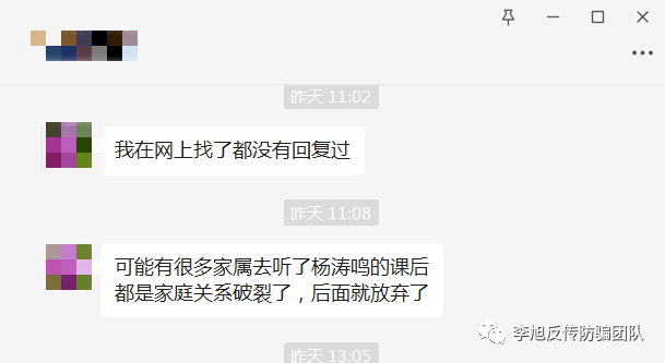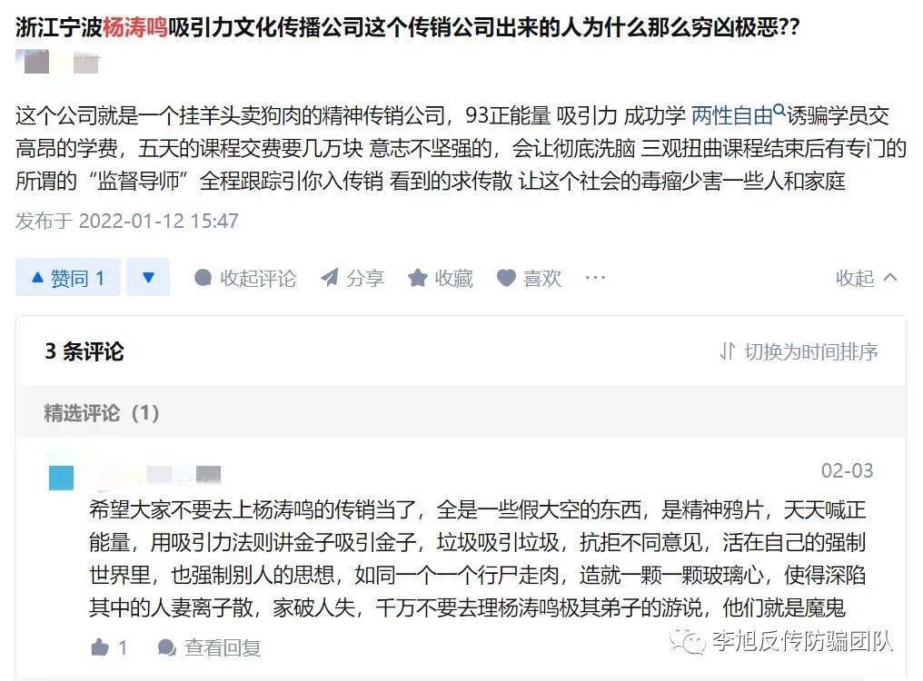 2022年4月25日,李旭反传防骗团队根据网友反馈信息,发布了一篇题为“精神传销危害大,网友陷入中谷道传销,又被杨涛鸣‘成功学’洗脑”的文章,文章中提到,网友刘女士跟我们反馈,其家人被朋友拉去宁波吸引力文化公司(以下简称吸引力公司)听杨涛鸣的课,甚至不惜套用信用卡交上课的费用。