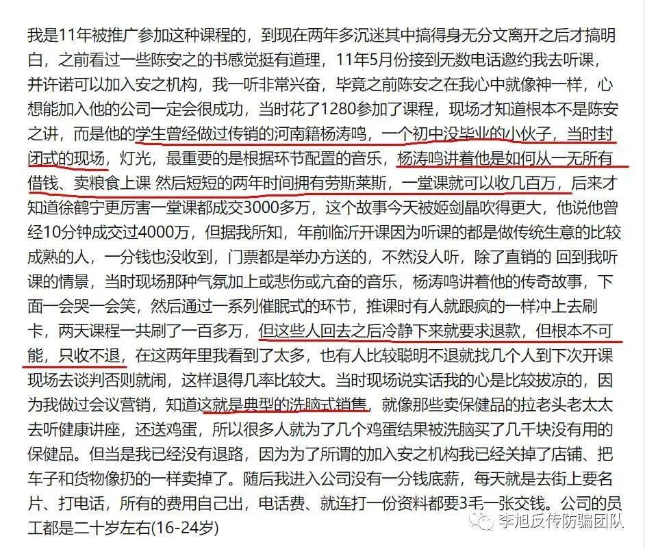 在杨涛鸣的各大宣传中,我们看到了一个熟悉的名字"陈安之"。然而,李旭反传防骗团队了解到,这个有着“成功学教父”之称的陈安之早年间就被爆骗取学员钱财。