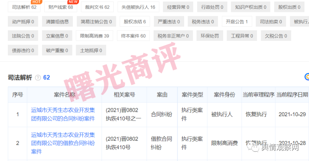 通过信用中国数据曙光商评发现,运城市天秀生态农业开发集团有限公司注册地位于运城市盐湖区红旗东街凰金园B座503室,法人张天江,成立于2017年,注册资本1.2亿元,实缴资本1200万元,参保人数无,自身风险高达184条,而三名实控股东张天江、宋伟、张录已被多次拉入失信被执行人,而企业本身也是诉讼不断,这样一家企业还能上市?真是让人匪夷所思。