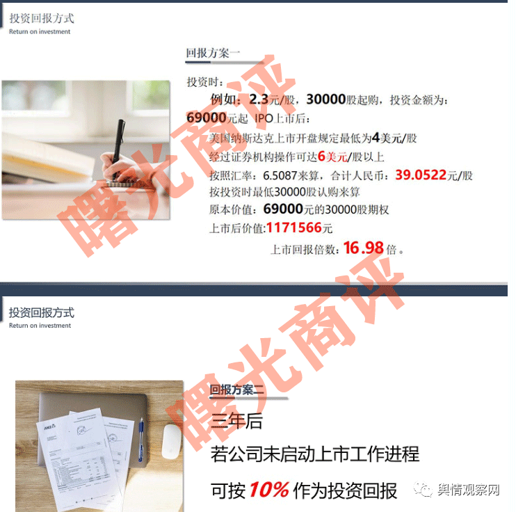 据悉,天秀集团自2021年就在启动上市会议,而知情人对曙光商评说:“这简直就是大扯虎皮”,以赴纳斯达克上市为由大肆兜售其原始股份,其计划出让32%的股份融资3.2亿元,宣传的上市回报高达17倍,投入6万元即可获取高达102万元的回报,若是未能上市,按年化10%作为回报,保本保息,简直稳赚不亏。