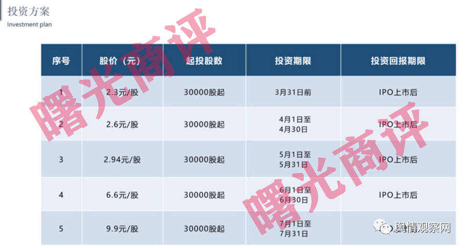 据其官宣资料显示,天秀集团主要经营范围包括农林种植、荒山绿化、生态农业园林开发、殡仪礼仪服务等业力,而为了更快的兜售其原始股份,让更多的人员参与进来,曙光商评发现运城市天秀生态农业开发集团有限公司还推出了不同的投资节点,越是早参与越赚钱,例如,3月31日前,按2.3元/股,30000股起投,4月按就是2.6元/股,5月2.94元/股,6月6.6元/股,7月9.9元/股,投资的金额越多,获取的回报也就越高。