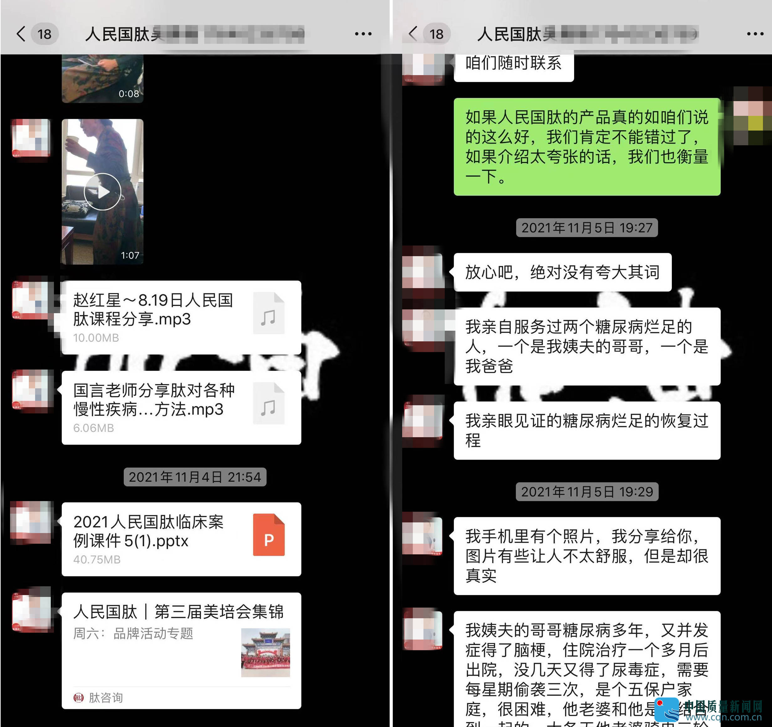 随即,吴某便发来数份服用肽前后对比的医院化验单、治愈糖尿病足、改善脾胃等病症的案例,以及“赵某星人民国肽课程分享”“国言老师分享肽对各种慢性疾病的作用和使用方法”的课程录音文件和《2021人民国肽临床案例课件5(1)》的演示文稿。