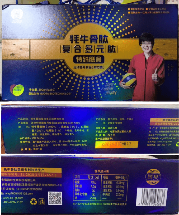 该产品包装显示,这是一款名为“国肽牦牛骨肽复合多元肽特殊膳食”的运动营养食品,适宜人群为运动人群,由安徽国肽生物科技有限公司生产。也就是说,“国言老师”宣传的对几十种疾病有效的产品不是“药品”,而是一款“营养食品”。