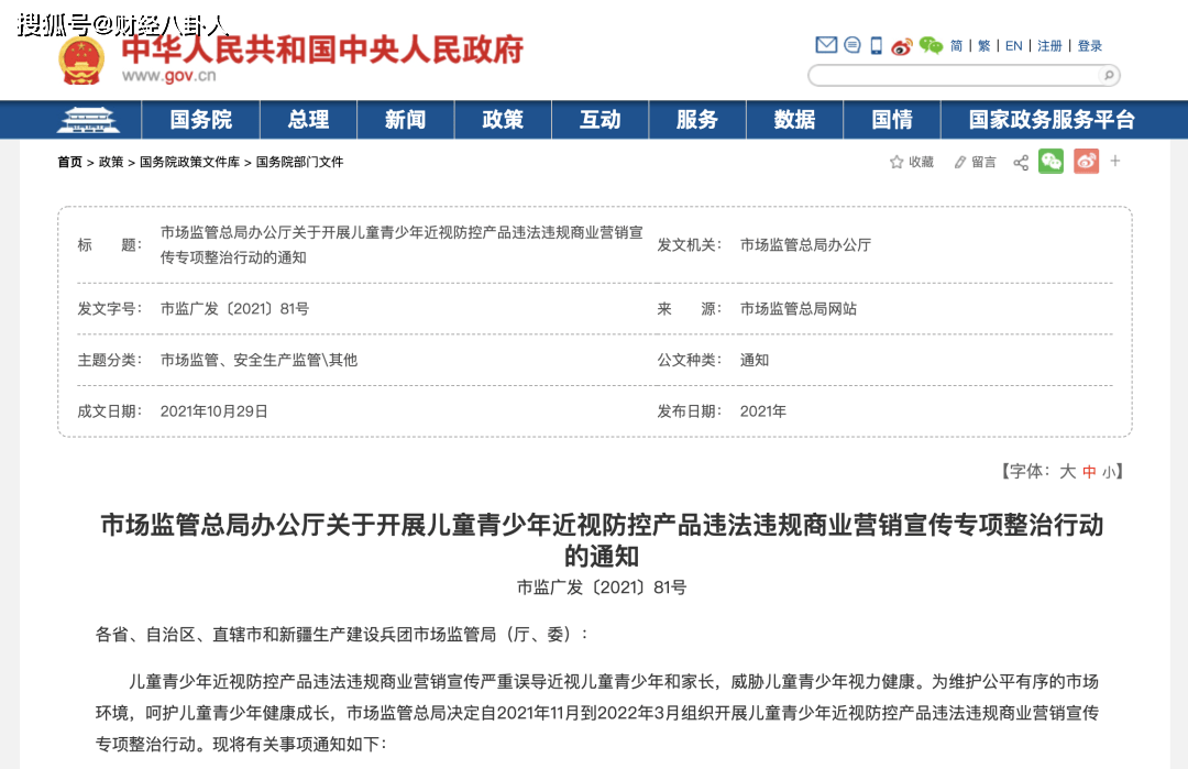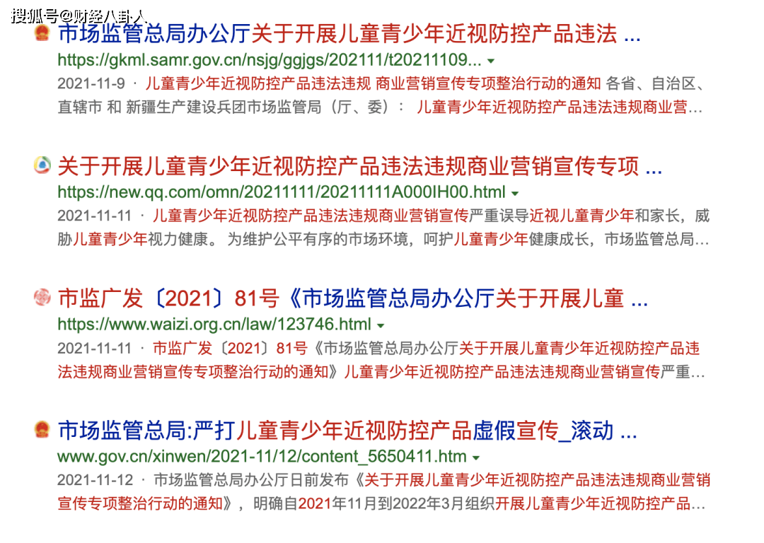 而在去年,市场监管总局办公厅就已下发《关于开展儿童青少年近视防控产品违法违规商业营销宣传专项整治行动的通知》(市监广发〔2021〕81号)。指出,各地市场监管部门要依法从严查处使用“康复”“恢复”“降低度数”“近视治愈”“近视克星”“度数修复”等误导性表述对儿童青少年近视防控产品进行营销宣传的行为。
