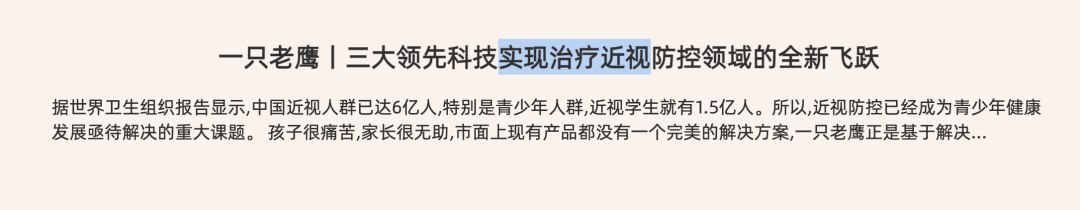 可见,国家对于此类问题已经高度重视。而一只老鹰“治疗近视”的宣传广告仍赫然醒目地摆在公司官网,严重污染了线上营销宣传环境,而一只老鹰的这条 “治疗近视”路还能走多久,还能飞多远,我们拭目以待。