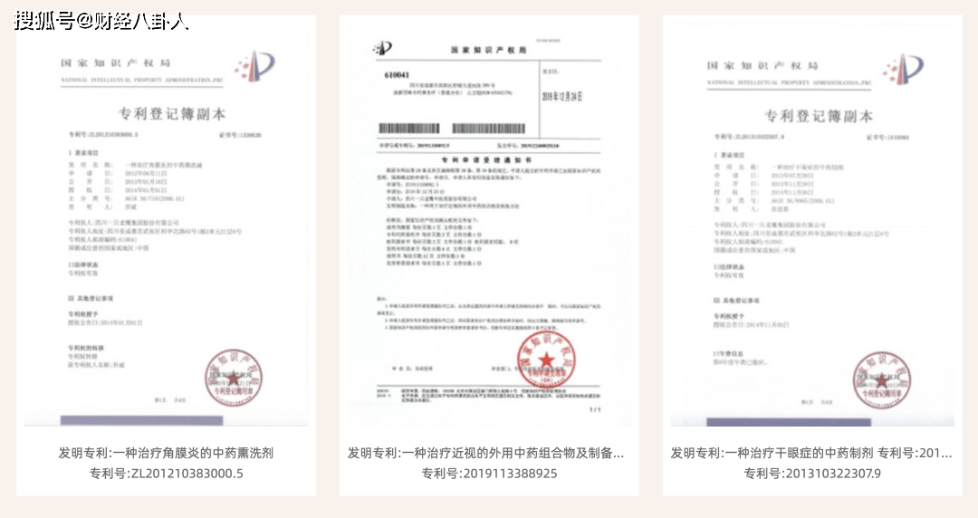 据其官网介绍,一只老鹰集团已获得多个眼健康领域的发明专利包括“一种治疗近视的外用中药组合物及制备方法(专利号:2019113388925)”、“一种治疗角膜炎的中药熏洗剂(专利号:ZL201210383000.5)”、“一种治疗干眼症的中药制剂(专利号:201310322307.9)”等30余类专利。依靠这些“科技”一只老鹰宣传自己已实现治疗近视的飞跃。通过在眼部的涂抹和喷雾 ,“补充营养,实现眼部自修功能”。