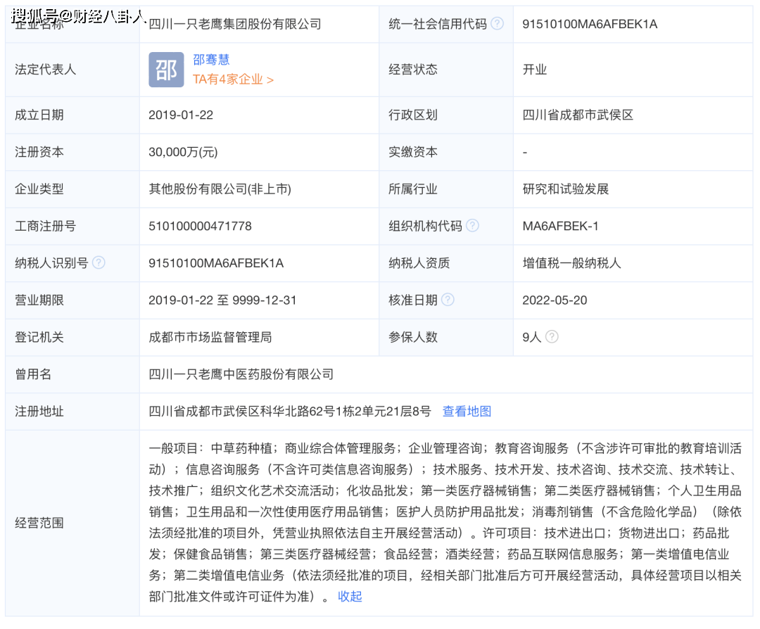 一只老鹰集团,全称为四川一只老鹰集团股份有限公司,2019年成立于四川省成都市武侯区,法定代表人为邵骞慧。据其官网介绍,这是一家致力于眼健康产业医药技术开发,药品、医疗器械及中医药创新应用产品研发、生产、运营的科技创新型企业。其现已开发的产品范围包括护眼日用品、眼科药品及医疗器械产品以及护眼食品等。