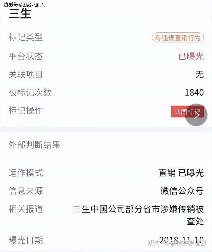 在腾讯灵鲲金融风险查询举报中心,三生(中国)被标记类型为“有违规直销行为”,平台状态“已曝光”,被标记次数达1926次。主要标签为拥有“直销牌照”、“有一定实力”、“谨慎参与”。