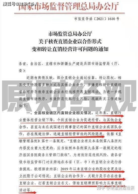 2021年9月30日,国家市场监督管理总局办公厅下发市监竞争函[2021]1620号《关于核查直销企业以合作形式变相转让直销经营许可问题的通知》就舆情反映的部分直销企业通过挂靠、转让股权、相互交叉持股等方式与其他企业合作,涉嫌变相转让直销经营许可的现象,进行进一步规范与风险防范。并指出个别直销企业为促进经营,与其他企业合作,有存在规避法律、逃避直销经营审批的风险隐患。重点梳理核查,2019年以来直销企业的股权变更及设立控股子公司情况;直销企业的合作方、关联方是否存在挂靠直销企业、打着直销企业名义、借助直销牌照影响力从事直销活动等。