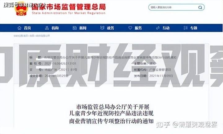 2021年11月,市场监管总局发布《关于开展儿童青少年近视防控产品违法违规商业营销宣传专项整治行动的通知》,通知要求严厉打击儿童青少年近视防控产品虚假违法营销宣传行为,依法从严查处使用“康复”“恢复”“降低度数”“近视治愈”“近视克星”“度数修复”等误导性表述。