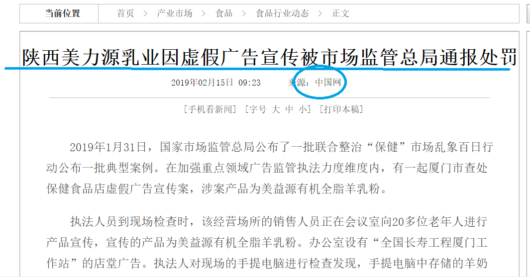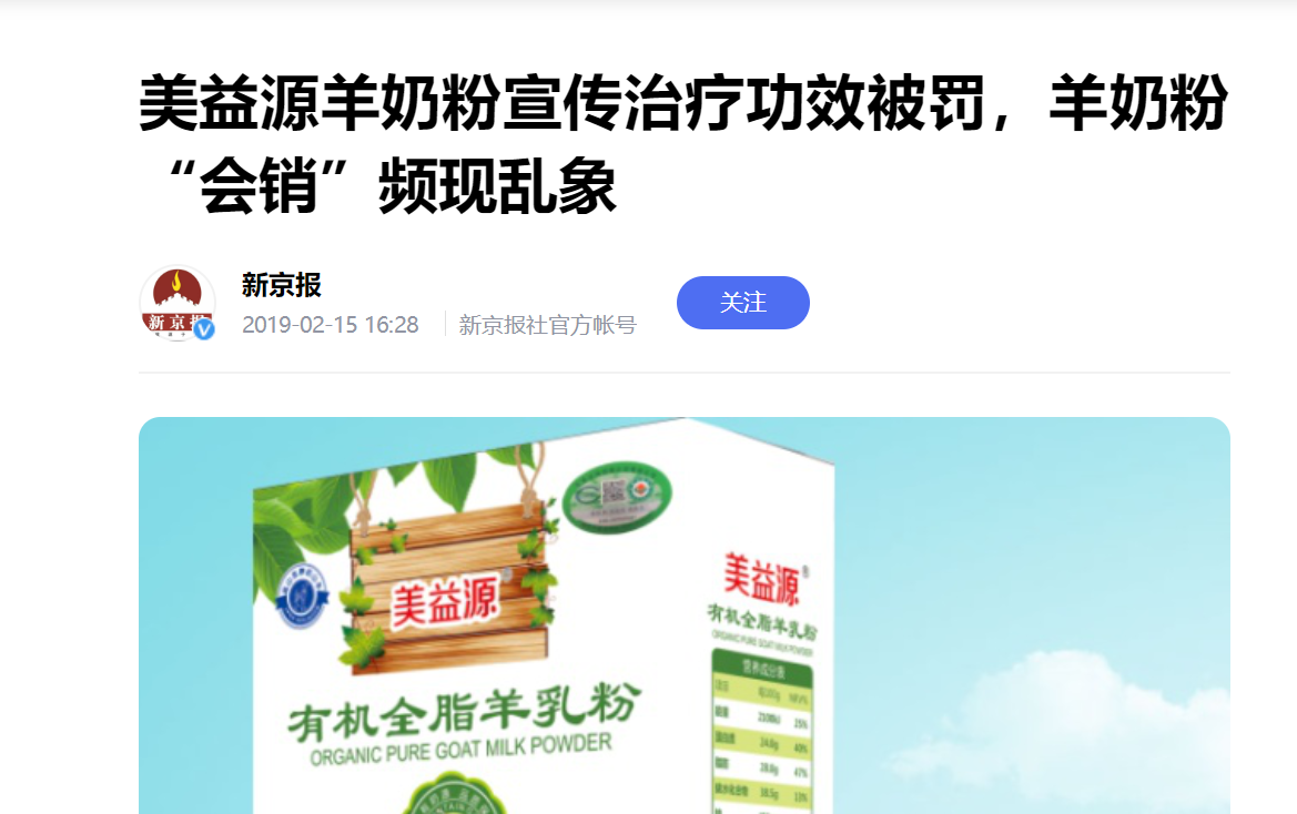 最引人关注是2019年年初,国家市场监管总局公布了一批联合整治“保健”市场乱象百日行动公布一批典型案例。其中有一起厦门市查处保健食品店虚假广告宣传案,涉案产品为陕西美力源集团旗下的美益源有机全脂羊乳粉。