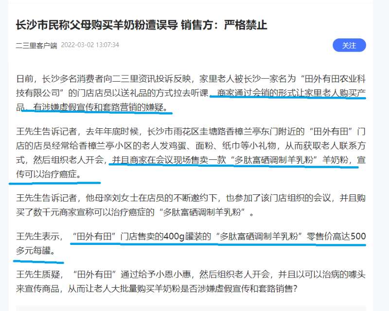 还有,有媒体记者报道称,来自长沙的多名消费者反映,家里老人被长沙一家名为“田外有田农业科技有限公司”的门店店员以送礼品的方式拉去听课,而商家在会议现场售卖一款“多肽富硒调制羊乳粉”羊奶粉,宣传可以治疗癌症,400g罐装的“多肽富硒调制羊乳粉”零售价高达500多元每罐。