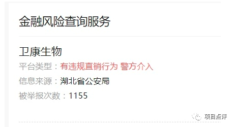 近期,通过公众号搜索查看得知“卫康生物”已经被湖北省某地公安局以“违规直销行为”为由介入调查,并且该公司遭受到了1155次举报。