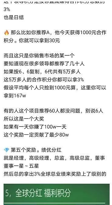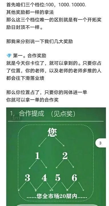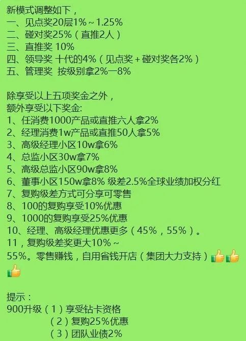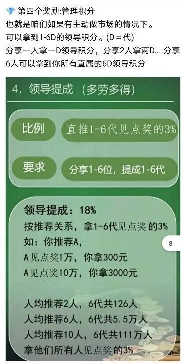 看下面这张卫康推广模式截图,图中很明显的写出见点奖20层1%-1.25%,领导奖拿十层4%。光看这两点就可以断定卫康的推广模式涉传了。这种模式是传统传销中典型的AB双轨制对碰返利机制,卫康搞的这一套就是在依托自己的产品搞传销。