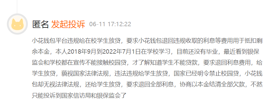 *小花钱包涉嫌向学生放贷,截图自黑猫投诉