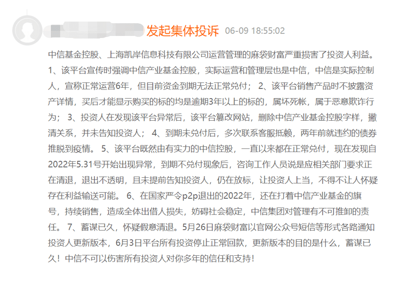 *投资人对麻袋财富进行集体投诉,截图自黑猫投诉网