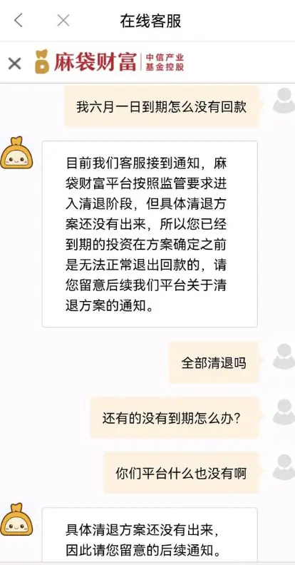 据这名投资者介绍,6月7日,其在联系到了麻袋理财客服,同样被通知该平台因要求清退,但却没有解释何时发布清退相关公示或者让投资人等待的公示。