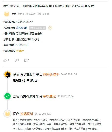 6月8日消息,有多名投资者日前通过黑猫投诉平台投诉麻袋财富损害投资人利益不回款。其中一投资者表示,自己爱人在麻袋财富出借款10万余元,本应该2022年6月5日投资到期,麻袋财富要给其返回出借款和利息,至今未返回一分钱。