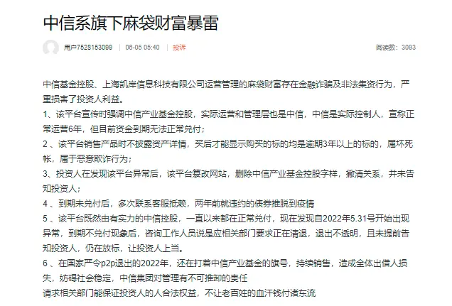 值得关注的是,在其他的社交平台,有投资者更是控诉麻袋财富存在金融诈骗及非法集资行为,严重损害了投资人利益,并详列了该平台存在的6大问题。