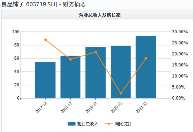 看上去,良品铺子近年营收稳步增加。2019年至2021年,该指标分别达到77亿元、79亿元与93亿元。