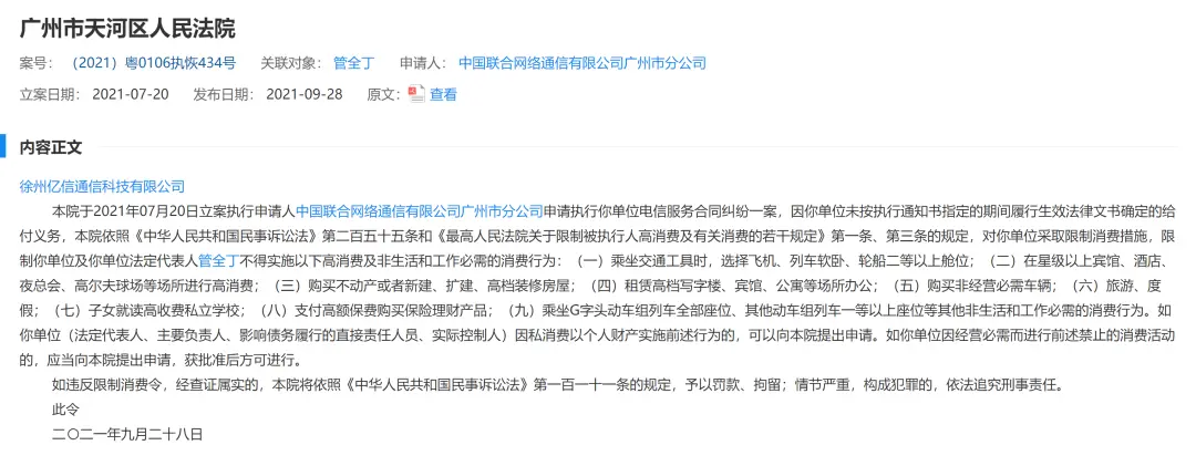 值得一提的是,管全丁在去年9月底已经被广州市天河区人民法院限制高消费。