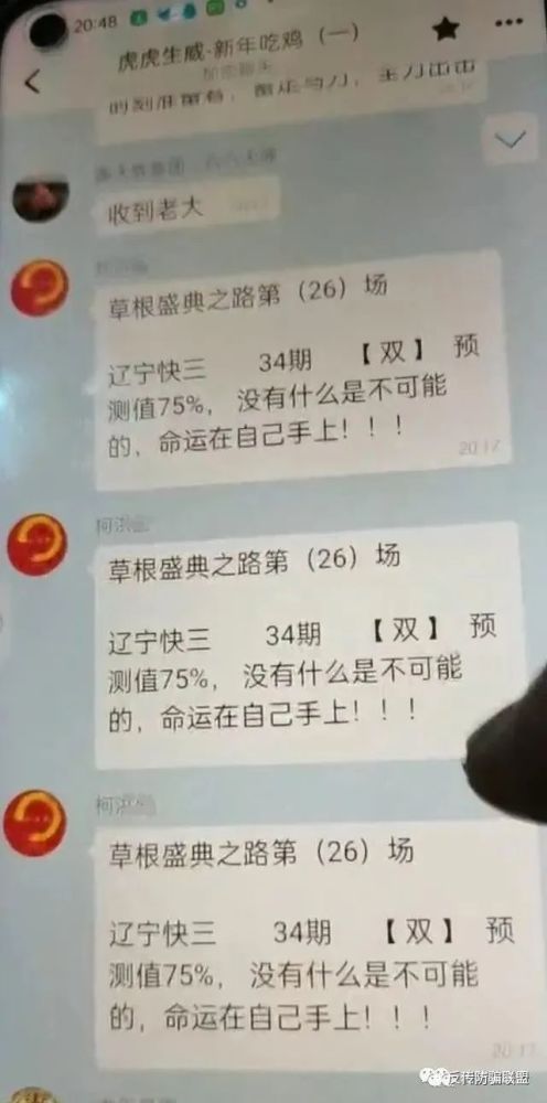 而柯某盛发布预测结果的话术也跟固定。比如,在“草根盛典之路”第(26)场时,对方发消息说:“辽宁快三,34期,【双】,测值75%,没有什么是不可能的,命运在自己手上。”