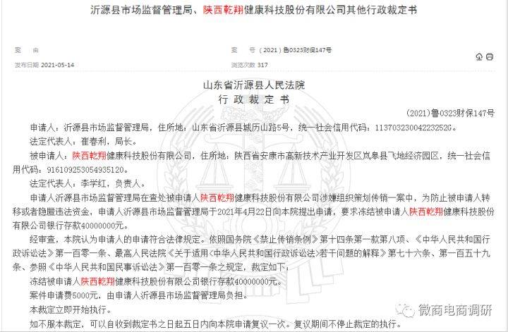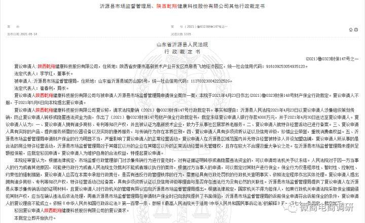 微商电商调研了解到,中国裁判文书网于2021年5月14日发布了《沂源县市场监督管理局、陕西乾翔健康科技股份有限公司其他行政裁定书》(以下简称《裁定书》)。